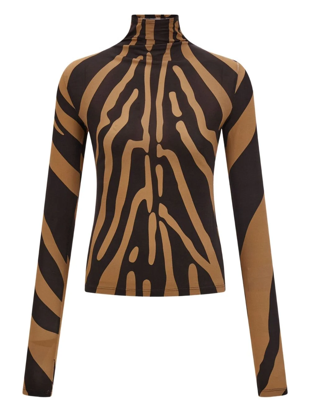 animal-print high-neck top Highlights - Camel and dark espresso - Animal print - Long sleeves - High neck Made in Italy Composition Viscose 92%, Elastane 8% Washing instructions Read Manufacturer Guidelines