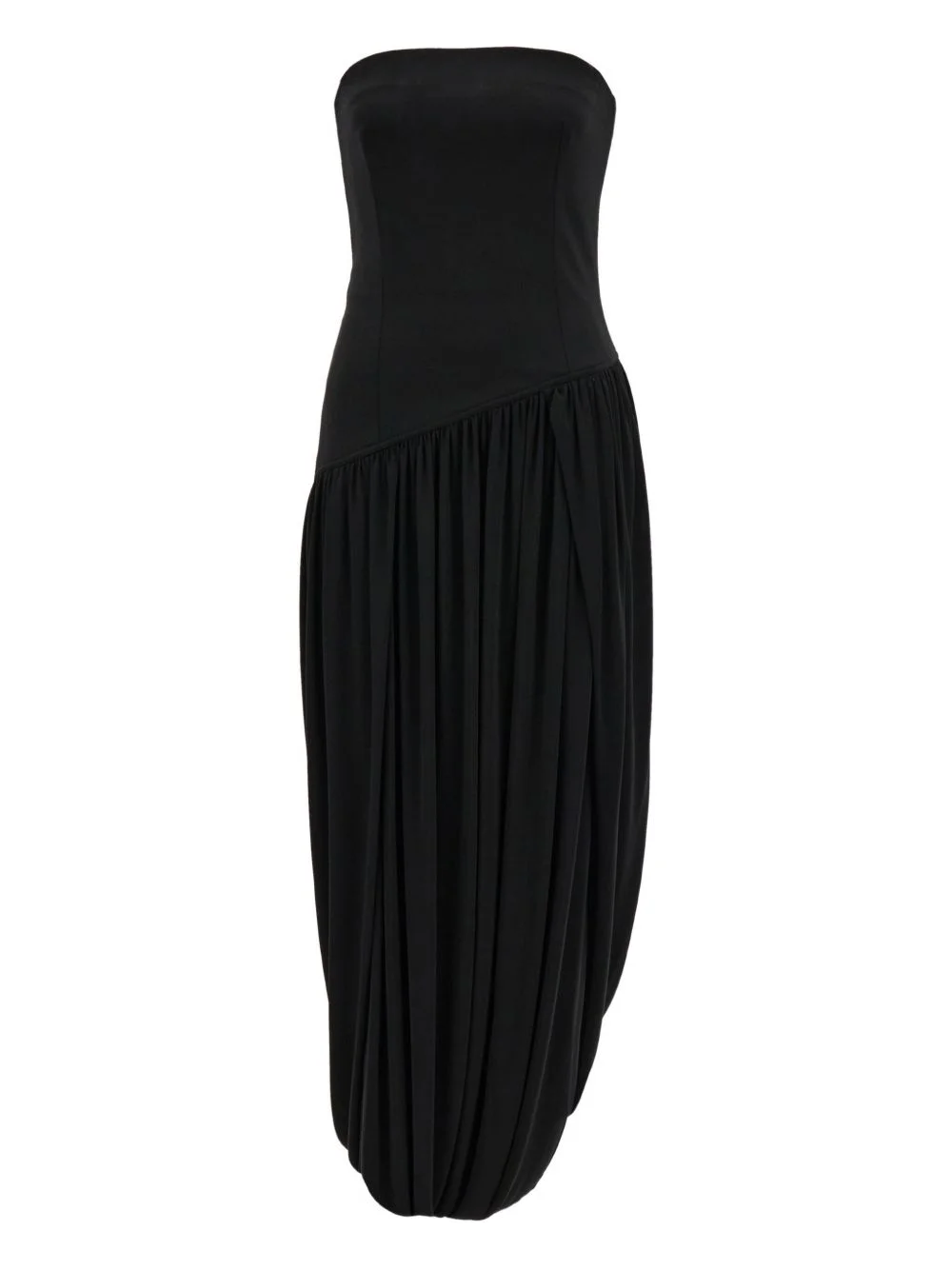 asymmetric ruched bustier midi dress Highlights - Black - Asymmetric waist - Ruched detailing - Draped effect - Strapless - Bustier bodice Made in Italy Composition Viscose 93%, Elastane 7% Washing instructions Read Manufacturer Guidelines