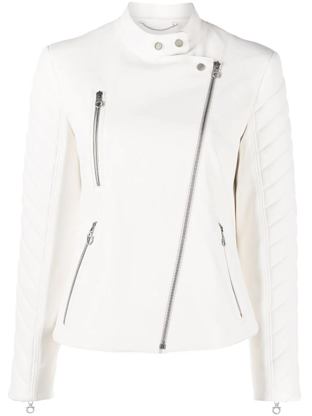 biker leather jacket off white lamb skin quilted panels round neck front zip fastening pockets off-centre front zip fastening long sleeves curved hem Made in Italy Composition Outer: Lamb Skin 100% Lining: Polyurethane 100%, Cellulose 67%, Silk 33% SIZE & FIT Model measurements Height 5 ft 10 in(1.78 m) Bust/Chest 31.49 in(80 cm) Hips 36.22 in(92 cm) Waist 25.59 in(65 cm) Washing instructions Specialist Cleaning