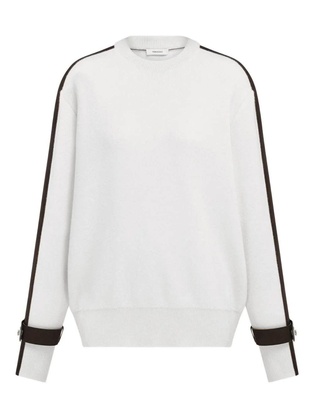 buckle-trim crew-neck sweater Highlights - White - Contrasting accents - Metallic buckles - Ribbed hem and cuffs Made in Italy Composition Virgin Wool 100% Washing instructions Read Manufacturer Guidelines