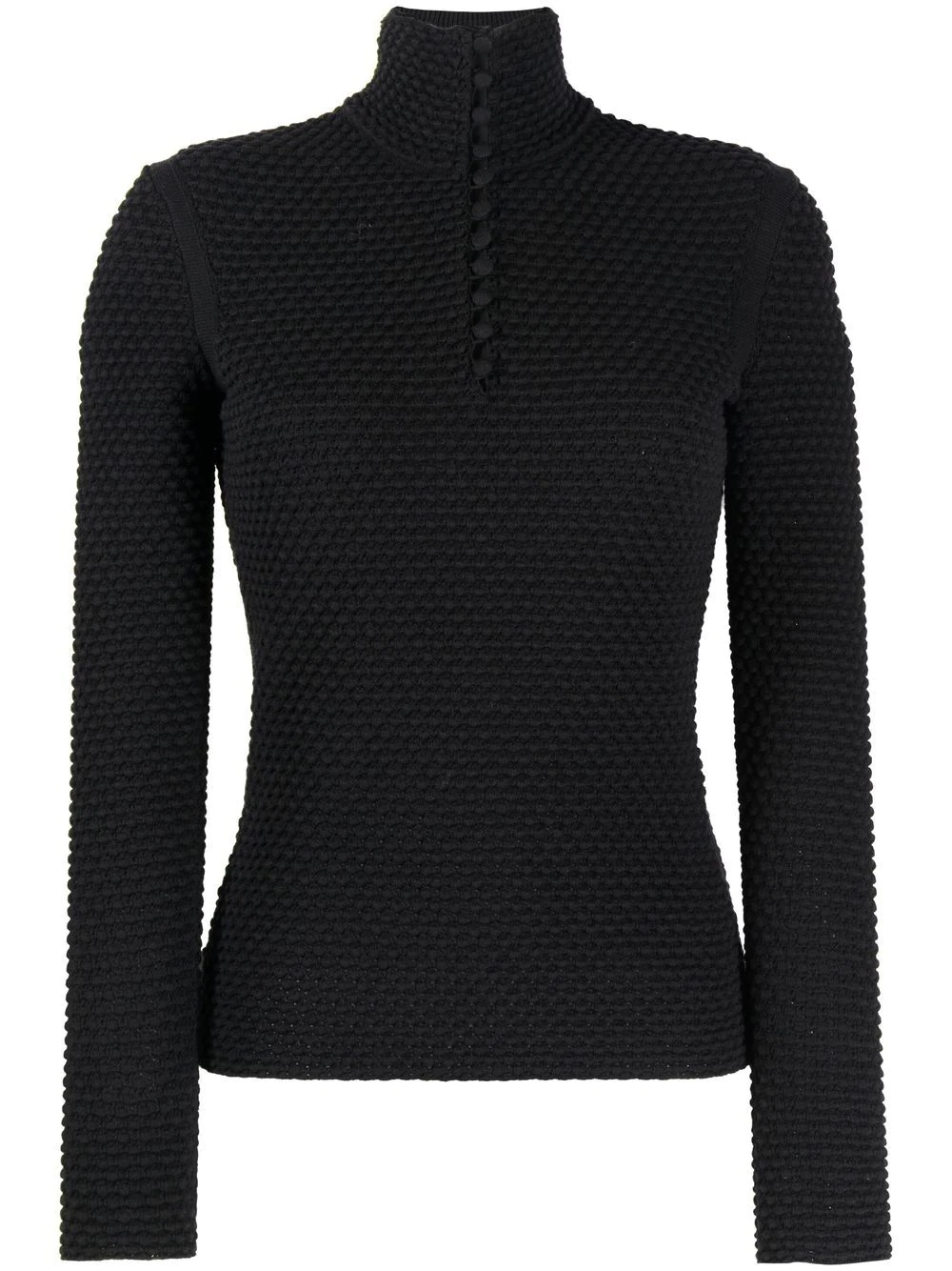 buttoned open-knit jumper buttoned open-knit jumper from FERRAGAMO featuring black, cotton blend, open knit, front button fastening, high neck, long sleeves and straight hem. Made in Italy Composition Cotton 71%, Polyamide 29% SIZE & FIT Model measurements Height 5 ft 10 in(1.78 m) Bust/Chest 31.49 in(80 cm) Hips 35.43 in(90 cm) Waist 24.4 in(62 cm) FittingInformation This piece fits true to size. We recommend you get your regular size Cut for a slim fit Made with a mid-weight fabric Washing instructions Dry Clean Only