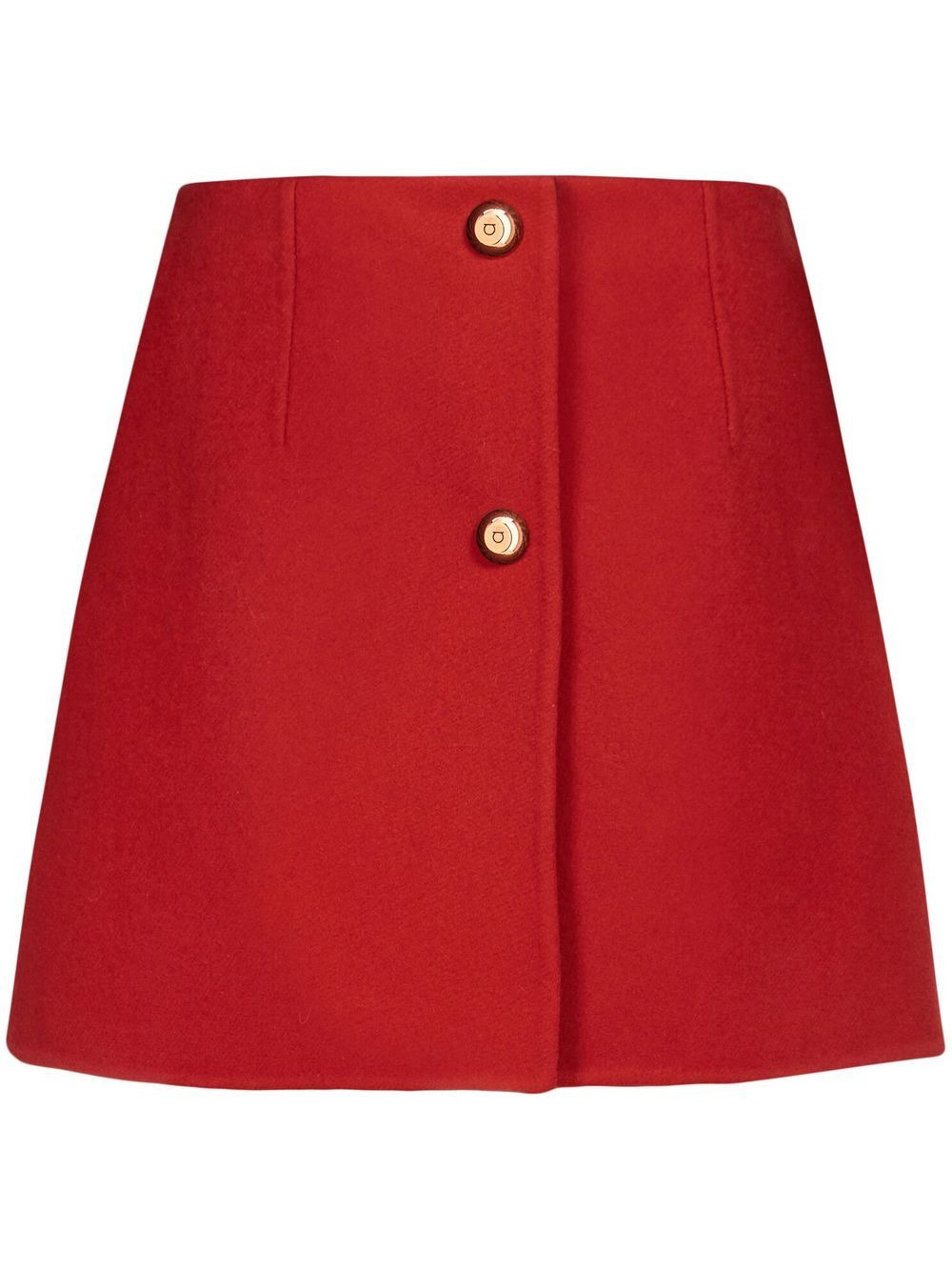 Cashmere-blend A-line mini skirt bright red cashmere blend A-line wraparound style high-waisted gold-tone Gancini buttons dart detailing straight hem Made in Italy Composition Wool 90%, Cashmere 10% Washing instructions Dry Clean Only