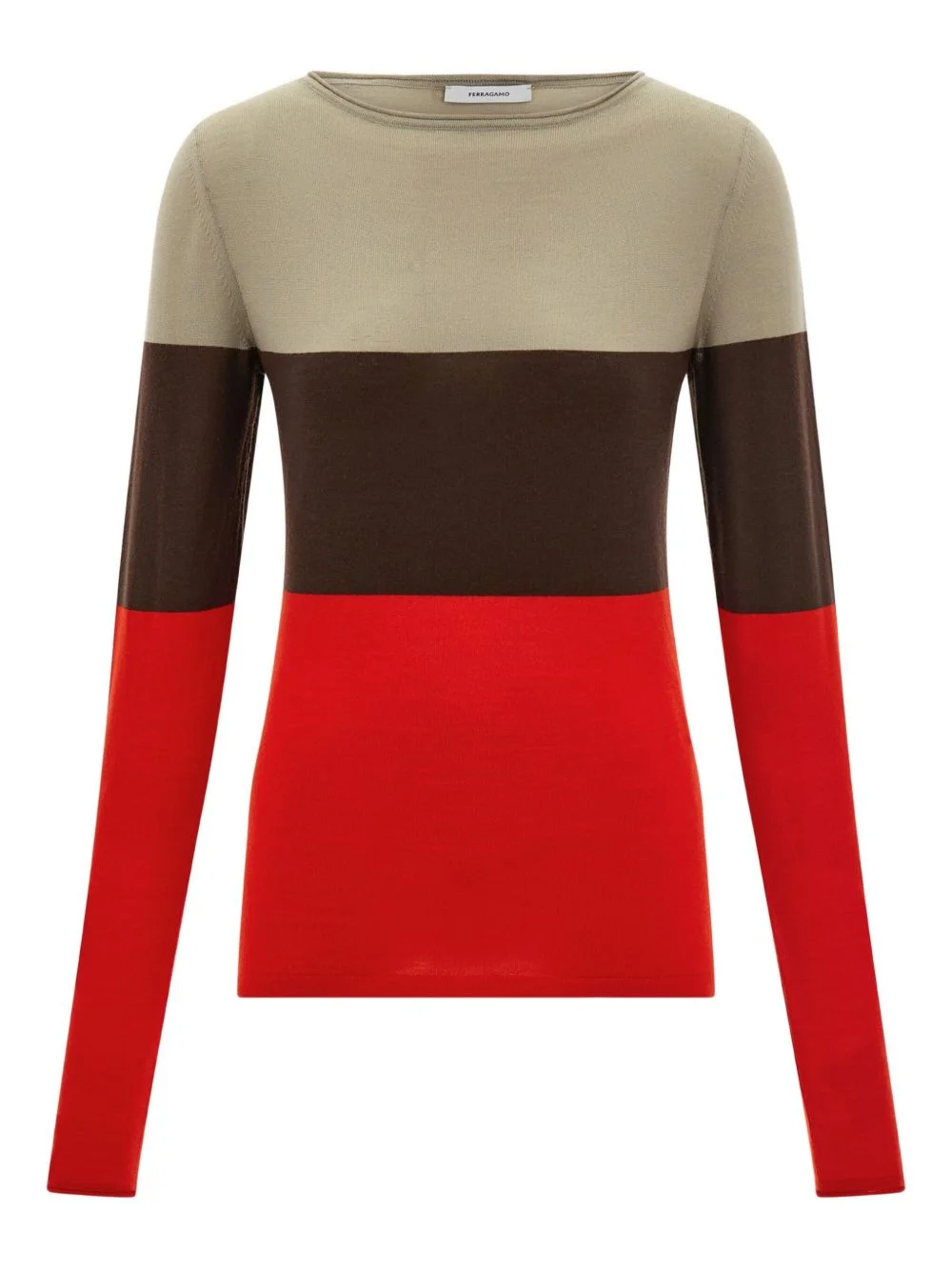 colour-block metal-tab top Highlights - Red and beige - Colour-block design - Boat neck - Long sleeves - Metal tab Made in Italy Composition Virgin Wool 100% Washing instructions Read Manufacturer Guidelines