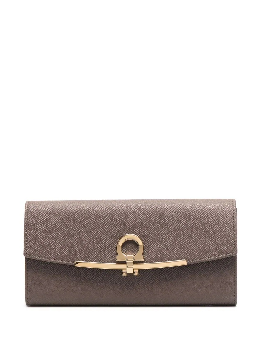Continental leather wallet taupe brown leather pebbled texture Gancini plaque gold-tone hardware partitioned compartment internal zip pocket internal card slots foldover top Made in Italy Composition Outer: Leather 100%