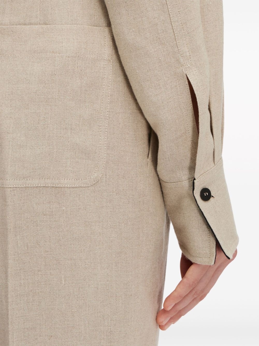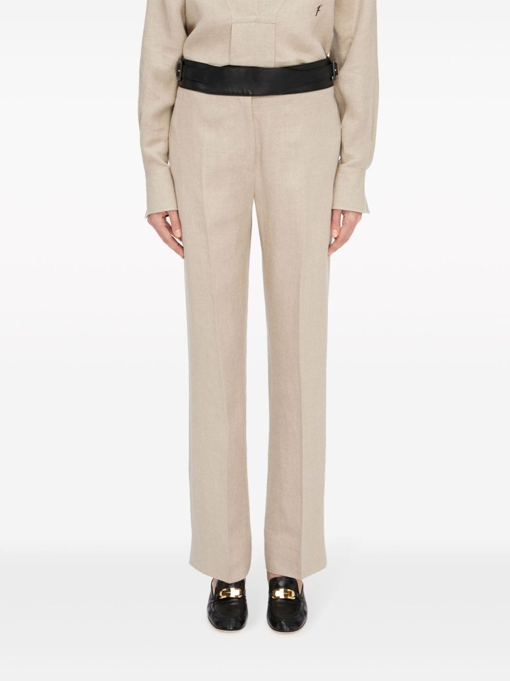 contrast-belt tailored linen trousers Highlights - Beige - Linen - Faux-leather trim - Belted waist tabs - Front zip fastening - Slip pockets to the sides - Pressed crease - Rear patch pocket - Slim cut - This item contains at least 50% materials which are certified or widely recognised as having a lower environmental impact through production and/or manufacturing processes that reduce water consumption and the use of harmful chemicals, or re-use by-products of the production process. Made in Italy Composition Outer: Linen/Flax 100% Lining: Polyester 60%, Cotton 40%