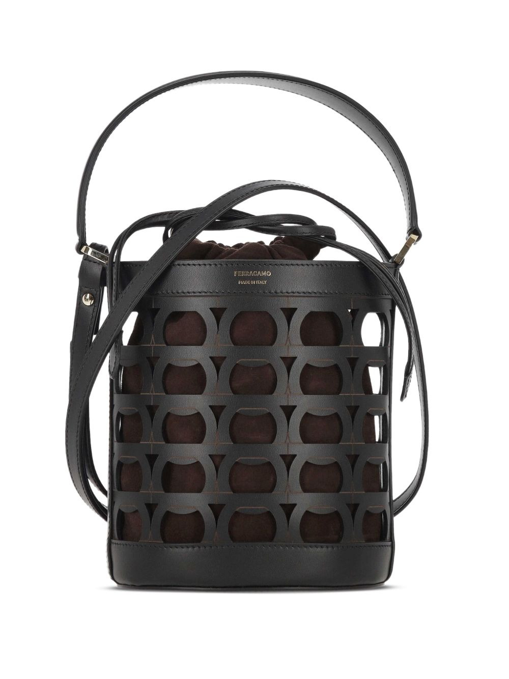 cut-out bucket bag Highlights - Black - Calf leather - Circular cut-outs - Brown suede lining - Top handle - Detachable shoulder strap Made in Italy Composition Outer: Calf Leather 100% Lining: Lambskin 100%, Fabric 100% SIZE & FIT Measurement DEPTH 9.05 in(23 cm) HEIGHT 7.08 in(18 cm) STRAP 5.51 in(14 cm) WIDTH 3.93 in(10 cm)