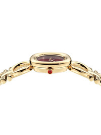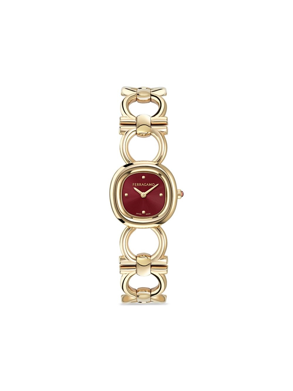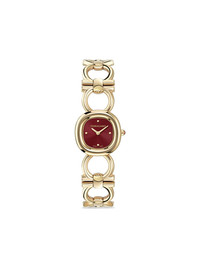Double Gancini 25mm Highlights - 25mm - Yellow gold/stainless steel - Quartz movement - Round face - Burgundy - Sunray-patterned dial - Sapphire-crystal glass - Screw-down crown - Double gancini bracelet - Buckle fastening - Water resistance up to 50m/5 atm - This item comes with a standard two-year warranty from the brand. Imported SIZE & FIT Measurement DIAMETER 0.98 in(2.5 cm)