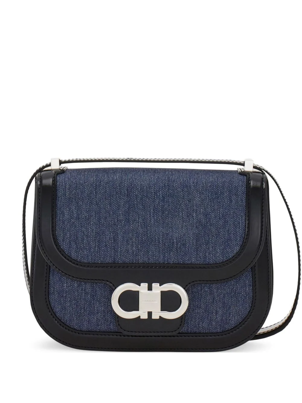 double Gancini crossbody bag (XS) Highlights - Pretty and petite with a contemporary attitude, this ferragamo crossbody is compact, cool and practical. cut from soft italian leather, the dials are detailed with cool indigo denim, adding a casual twist to the ladylike silhouette. the front flap, with double gancio clasp, opens to a lined interior and the thread-through strap works both cross body and over the shoulder. - Indigo blue/black - Cotton Made in Italy Composition Outer: Cotton 99%, Calf Leather 85%, Denim 15%, Elastane 1% SIZE & FIT Measurement DEPTH 2.75 in(7 cm) HEIGHT 6.69 in(17 cm) STRAP 19.68 in(50 cm) WIDTH 8.46 in(21.5 cm)