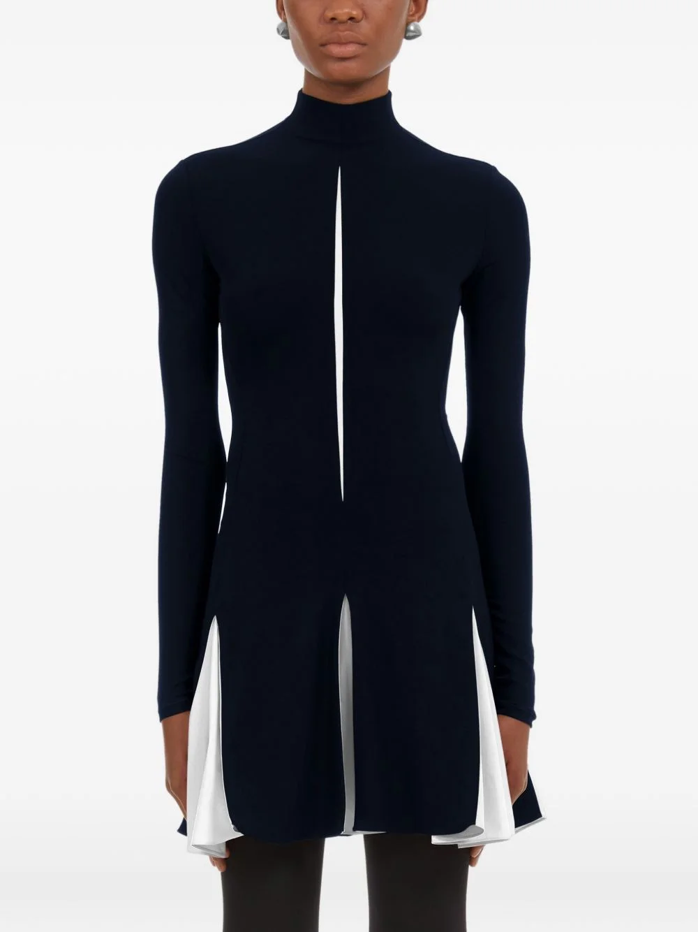 Dress with contrasting inserts Highlights - Navy blue - High neck - Long sleeves - Inserts - Flared skirt - Mid-thigh length Made in Italy Composition Viscose 95%, Elastane 5% Washing instructions Read Manufacturer Guidelines