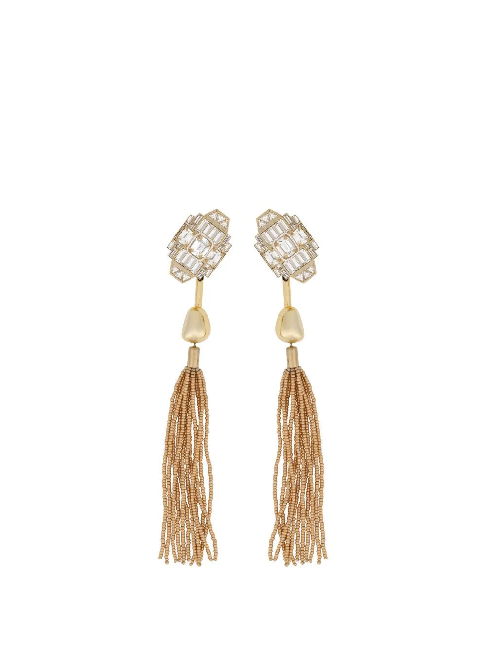 drop earrings Highlights - Inspired by art deco jewels, these drop earrings catch the light - and the eye - amid your hair, with baguette-cut crystals set into a gold-tone base of clean, geometric lines. a colorful resin pearl and delicate glass-beaded tassels add a playful, lightweight finish to the look. - God-tone - Crystal embellishment - These earrings come as a pair. Made in Italy