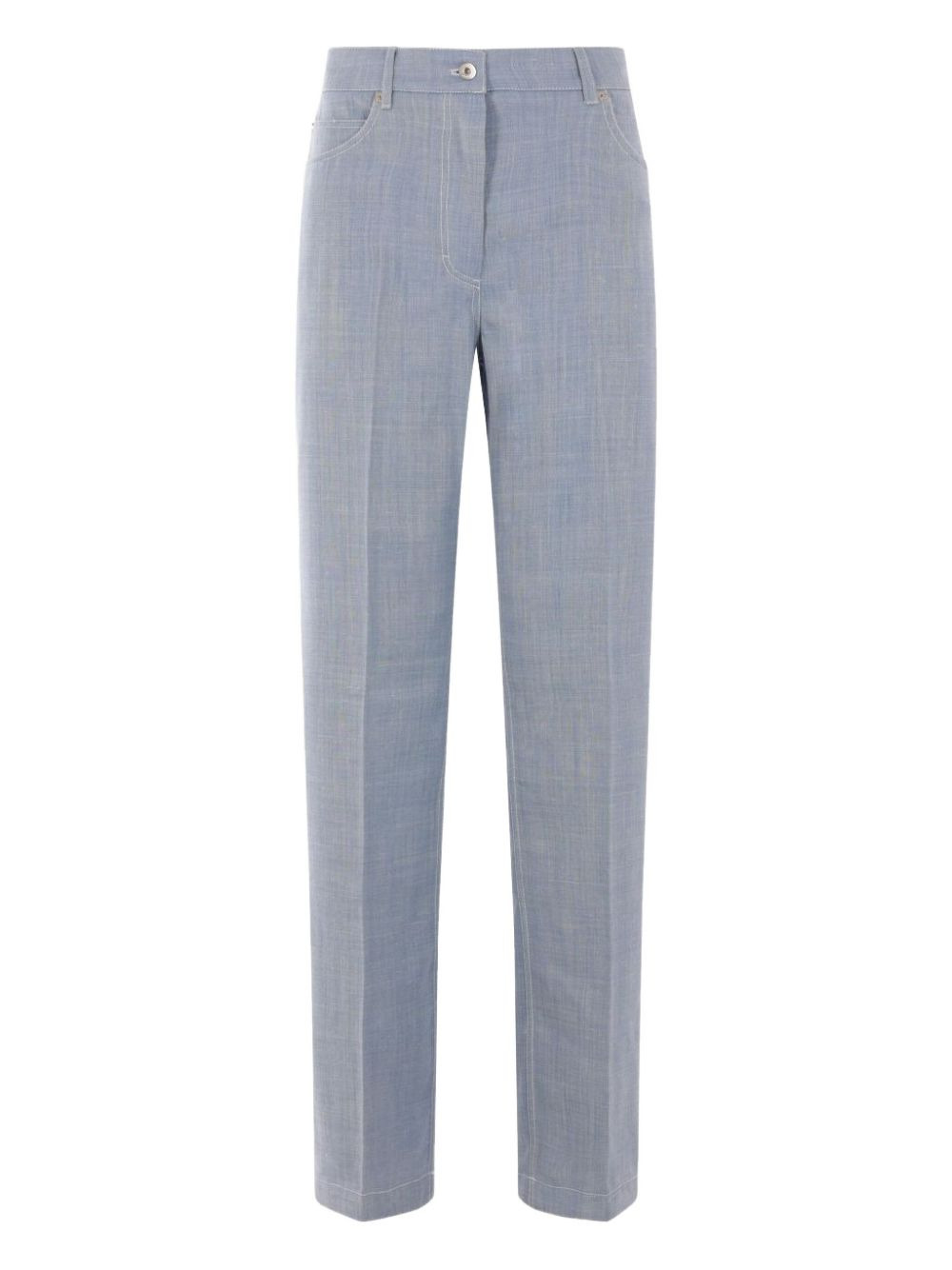 Five pocket trousers Highlights - Light blue - Front button and zip fastening - Belt loops - Logo patch to the rear - Straight leg Made in Italy Composition Virgin Wool 70%, Silk 20%, Linen/Flax 10%