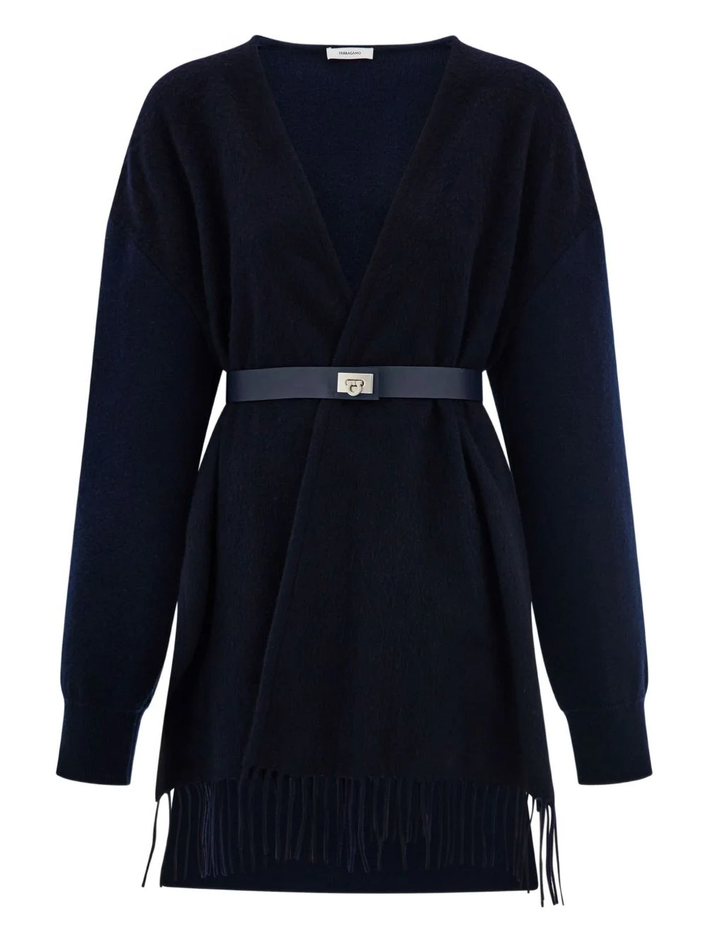 fringed belted cardigan Highlights - Navy blue - Ribbed cuffs - Adjustable belt - Buckle fastening Made in Italy Composition Virgin Wool 70%, Cashmere 30% Washing instructions Read Manufacturer Guidelines