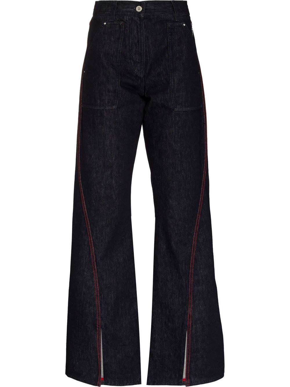 front-slit wide-leg jeans midnight blue cotton contrast stitching mid-rise belt loops front button and zip fastening two front patch pockets two rear patch pockets logo patch to the rear wide leg front slit Made in Italy Composition Cotton 100% SIZE & FIT Model measurements Height 5 ft 11 in(1.8 m) Bust/Chest 31.49 in(80 cm) Hips 36.22 in(92 cm) Waist 25.59 in(65 cm) FittingInformation This piece fits true to size. We recommend you get your regular size Cut for a loose fit Made with a mid-weight non-stretch fabric Washing instructions Hand Wash