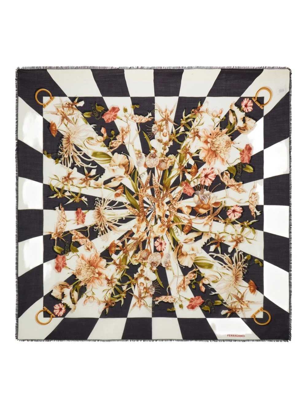 Gaia-print silk scarf Highlights - Black and ivory - Pure wool - Gaia floral print - Optical-print backdrop - Square shape - Fringed edge Made in Italy Composition Wool 100% SIZE & FIT Measurement LENGTH 55.11 in(140 cm) WIDTH 55.11 in(140 cm)