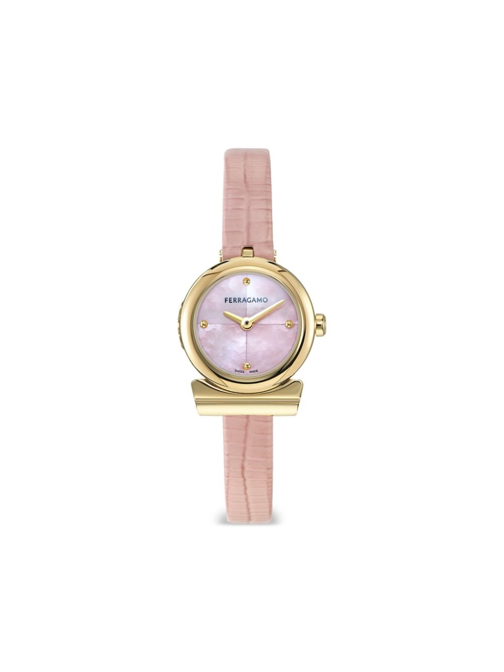Gancini 22.5mm Highlights - Stainless steel case - Quartz movement - Light pink - Geometric dial - Arrow hands - Logo print embellishment - Round face - Screw-down crown - Leather strap - Tang-buckle fastening - Water resistance up to 30m/3 atm - This item comes with a standard two-year warranty from the brand. Imported