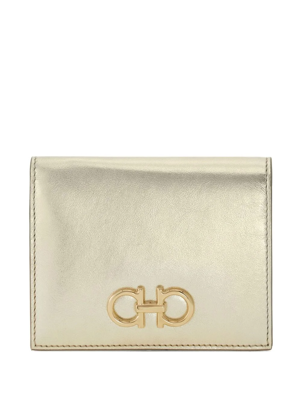 Gancini buckle compact wallet Highlights - Champagne - Calfskin leather - Gancini buckle - Bill compartments - Slit pockets - Coin pocket - Snap button closure Made in Italy Composition Outer: CALFSKIN 100% Lining: CALFSKIN 60%, Fabric 40% SIZE & FIT Measurement HEIGHT 3.5 in(8.9 cm) WIDTH 4.4 in(11.2 cm)