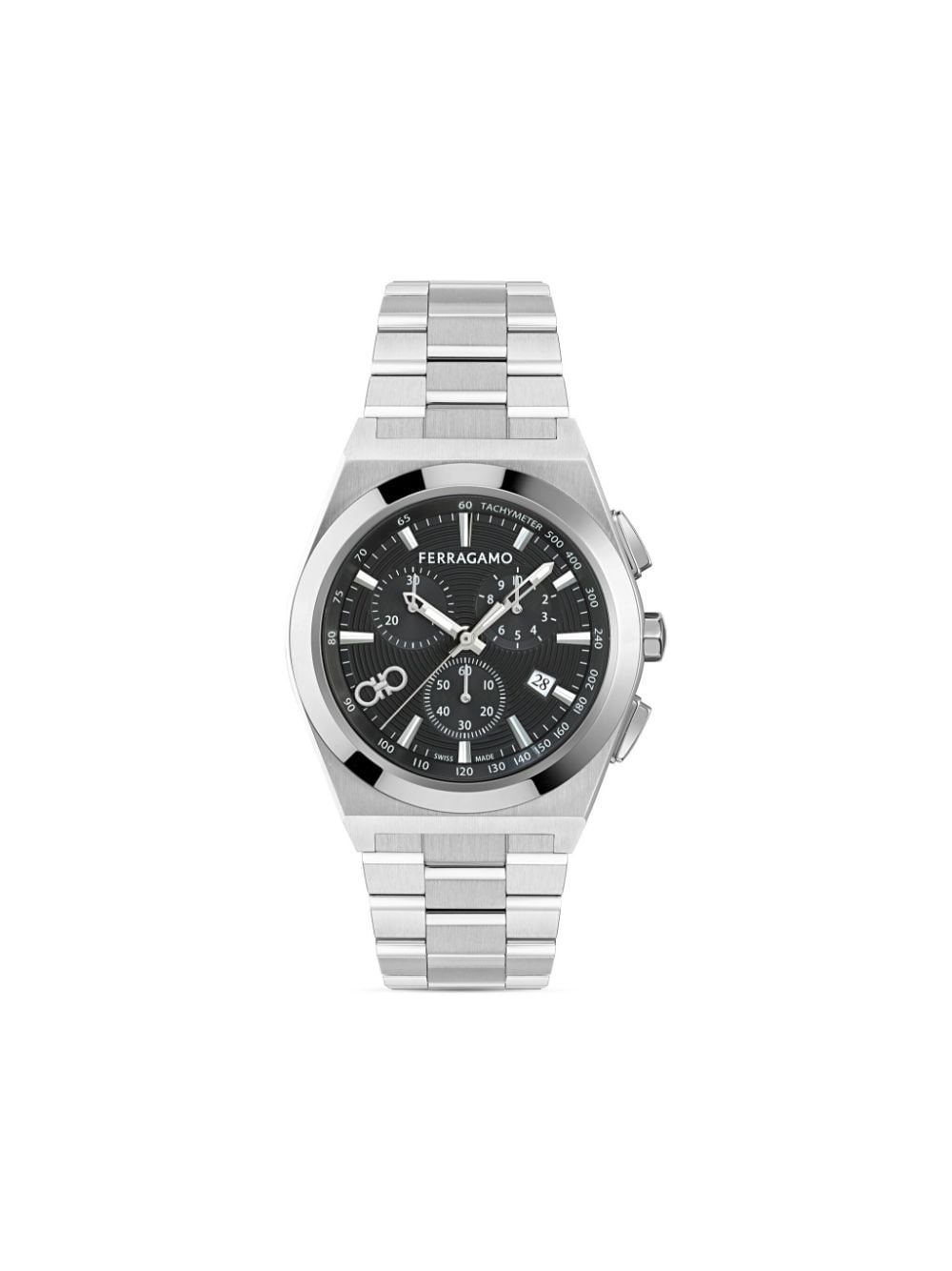 Vega Upper East Chrono 42mm Highlights - 42mm - Stainless steel case - Quartz movement - Round face - Baton dial - Baton hands - Gancini plaque - Chronograph counters - Date indication - Sapphire-crystal glass - Two chronograph pushers - Screw-down crown - Stainless steel link bracelet - Folding clasp Imported Composition stainless steel 100%, Sapphire Crystal 100% SIZE & FIT Measurement DIAMETER 1.65 in(4.2 cm)