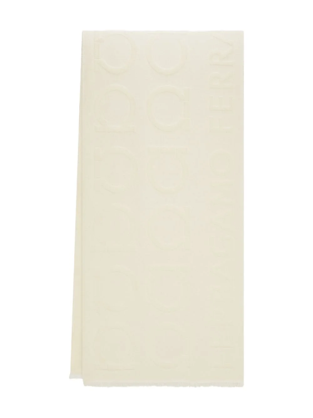 Gancini jacquard logo scarf Highlights - Ivory - Jacquard weave - Logo lettering Made in Italy Composition Wool 90%, Silk 10% SIZE & FIT Measurement LENGTH 70.86 in(180 cm) WIDTH 15.74 in(40 cm)
