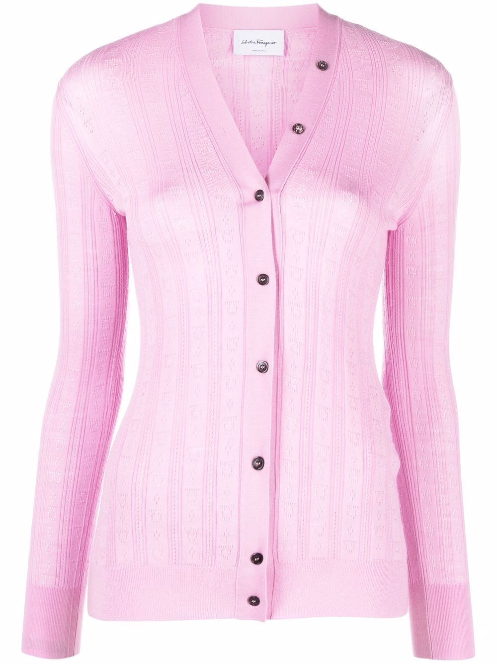 Gancini knitted cardigan flamingo pink wool pointelle knit Gancini print V-neck front button fastening long sleeves straight hem Made in Italy Composition Virgin Wool 100% SIZE & FIT Model measurements Height 5 ft 11 in(1.8 m) Bust/Chest 33.07 in(84 cm) Hips 37.4 in(95 cm) Waist 25.19 in(64 cm) Measurement SLEEVE LENGTH 23.22 in(59 cm) LENGTH 24.01 in(61 cm) Washing instructions Dry Clean Only