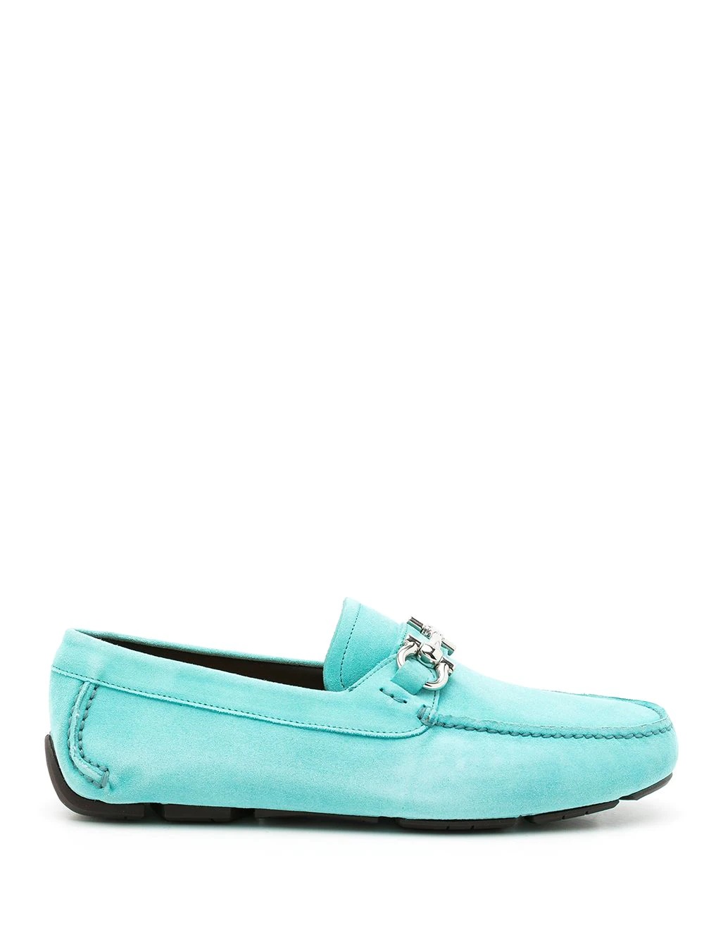 Gancini leather loafers Highlights - Turquoise - Leather - Almond toe - Gancini plaque - Branded insole - Slip-on style Made in Italy Composition Calf Leather 100% SIZE & FIT Measurement HEIGHT 3.14 in(8 cm) Inside Sole 11.22 in(28.5 cm) Sole height 0.19 in(0.5 cm)