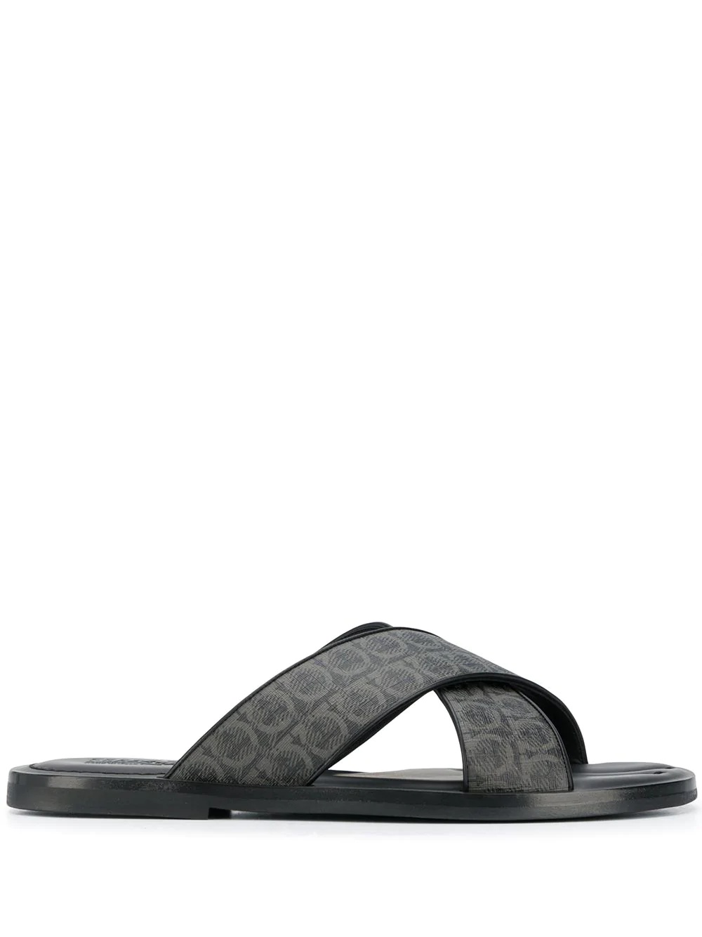 Gancini leather pool slides When it comes to summer, we love a good slip n' slide - as long as it's sponsored by Salvatore Ferragamo and we don't get wet (they're leather, afterall). Highlights - Grey - Leather - Open toe - Crossover strap detail - all-over logo print - Flat leather sole - Please note that this item has a medium fit (m) Made in Italy Composition Outer: Leather 100%, Fabric 100% Lining: Leather 100% SIZE & FIT Measurement HEEL 0.59 in(1.5 cm)