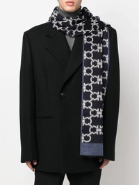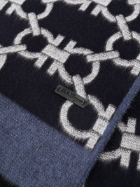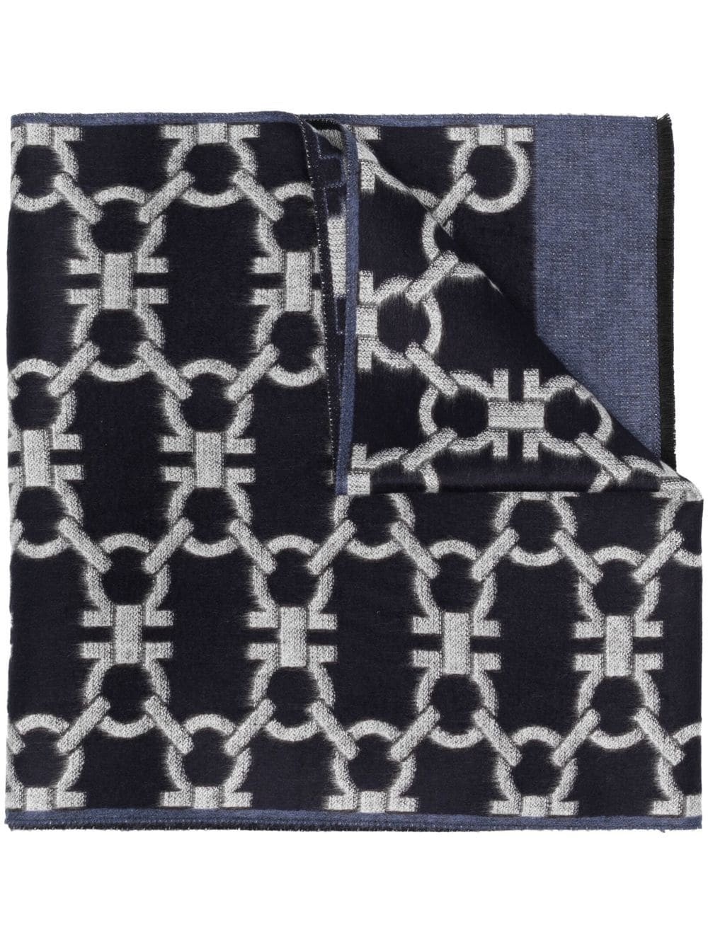 Gancini-pattern knitted scarf navy blue/lavender purple/ivory white cashmere-silk blend knitted construction Gancini print intarsia-knit logo logo patch to the front Made in Italy Composition Silk 51%, Cashmere 49% SIZE & FIT Model measurements Height 6 ft 2 in(1.87 m) Bust/Chest 35.82 in(91 cm) Hips 35.43 in(90 cm) Waist 27.95 in(71 cm) Measurement LENGTH 66.92 in(170 cm) WIDTH 13.77 in(35 cm) Washing instructions Dry Clean Only