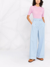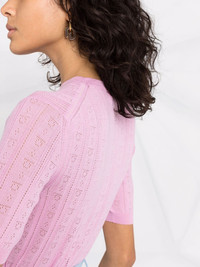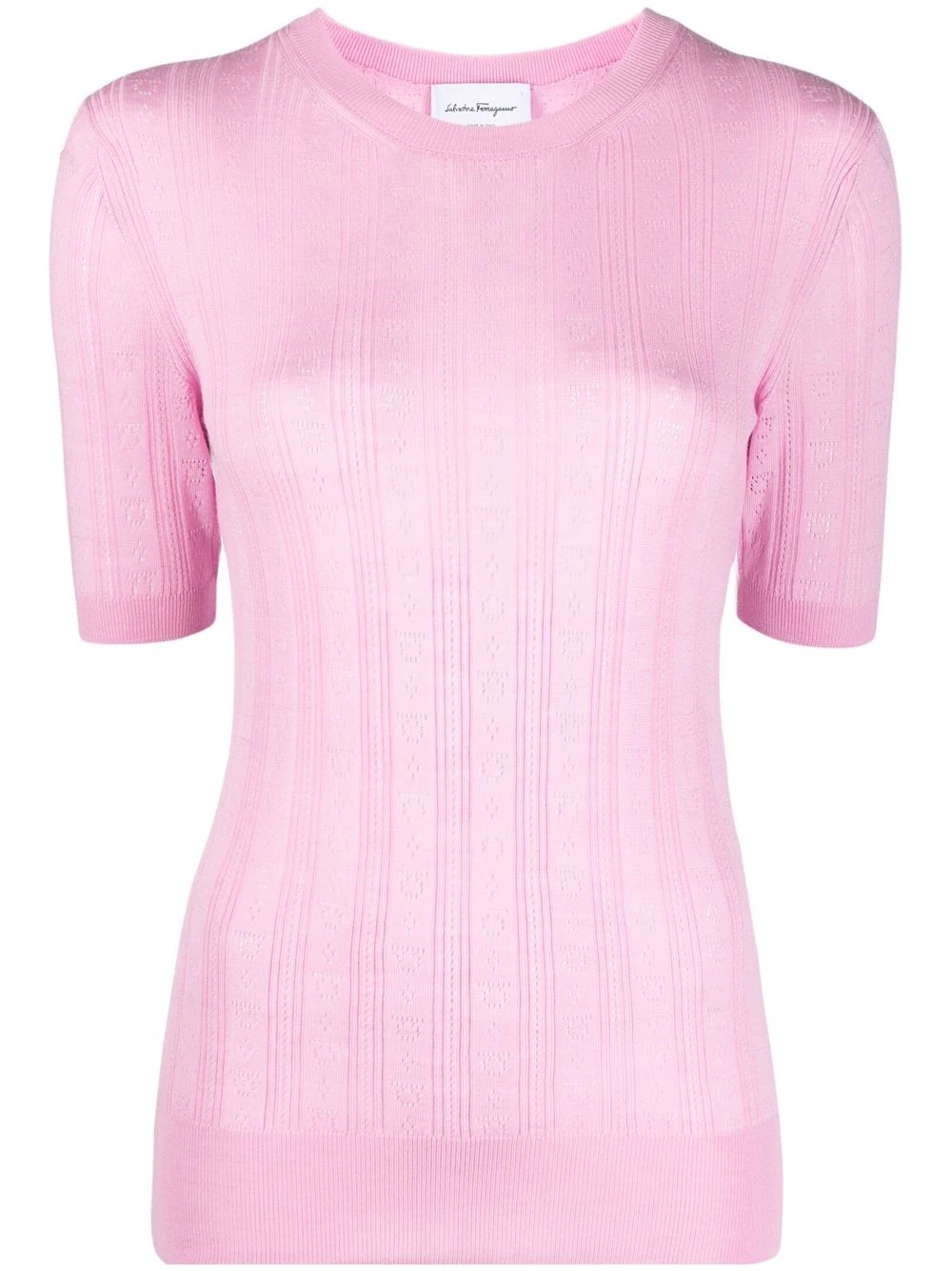 Gancini-pattern short-sleeve knitted top Designed with a slim fit in a light pink colourway, this short-sleeved knitted top from Ferragamo is detailed with a pattern of lines of mini Gancini logos that add a distinct texture to the design. Made in Italy Composition Virgin Wool 100% SIZE & FIT Model measurements Height 5 ft 9 in(1.76 m) Bust/Chest 31.88 in(81 cm) Hips 35.43 in(90 cm) Waist 24.8 in(63 cm) FittingInformation This piece fits true to size. We recommend you get your regular size Cut for a slim fit Made with a lightweight fabric Washing instructions Dry Clean Only