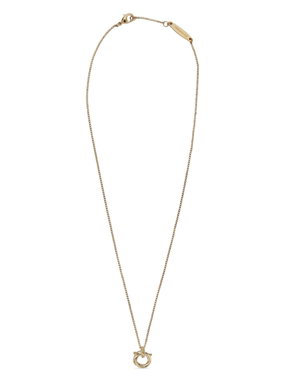 Gancini pendant necklace Highlights - Gold-tone - Gancini plaque - Delicate chain - Logo-engraved gold-tone hardware - Lobster claw fastening Made in Italy SIZE & FIT Measurement Length when open 16.14 in(41 cm) PENDANT LENGTH 0.31 in(0.8 cm) PENDANT WIDTH 0.39 in(1 cm) WIDTH 0.11 in(0.3 cm)