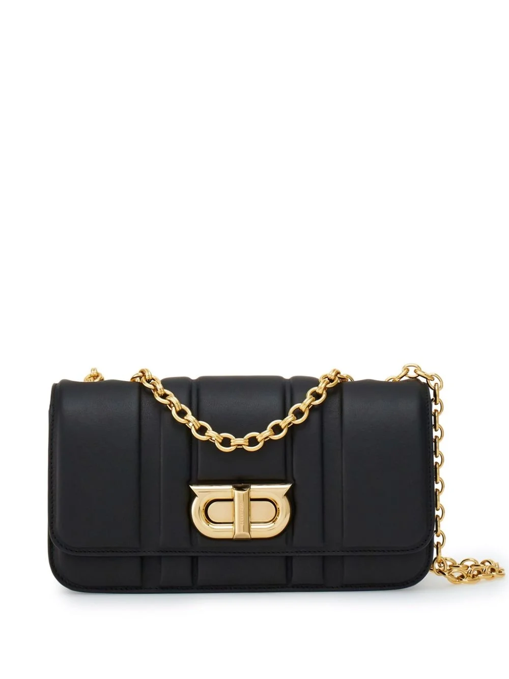 Gancini plaque leather shoulder bag Highlights - Black - Calf leather - Quilted finish - Gancini plaque - Gold-tone logo plaque - Gold-tone hardware - Foldover top - Adjustable leather and chain-link shoulder strap - Main compartment Made in Italy Composition Outer: CALFSKIN 100% Lining: Eco Leather 100% SIZE & FIT Measurement DEPTH 3.54 in(9 cm) HEIGHT 5.51 in(14 cm) WIDTH 9.84 in(25 cm)