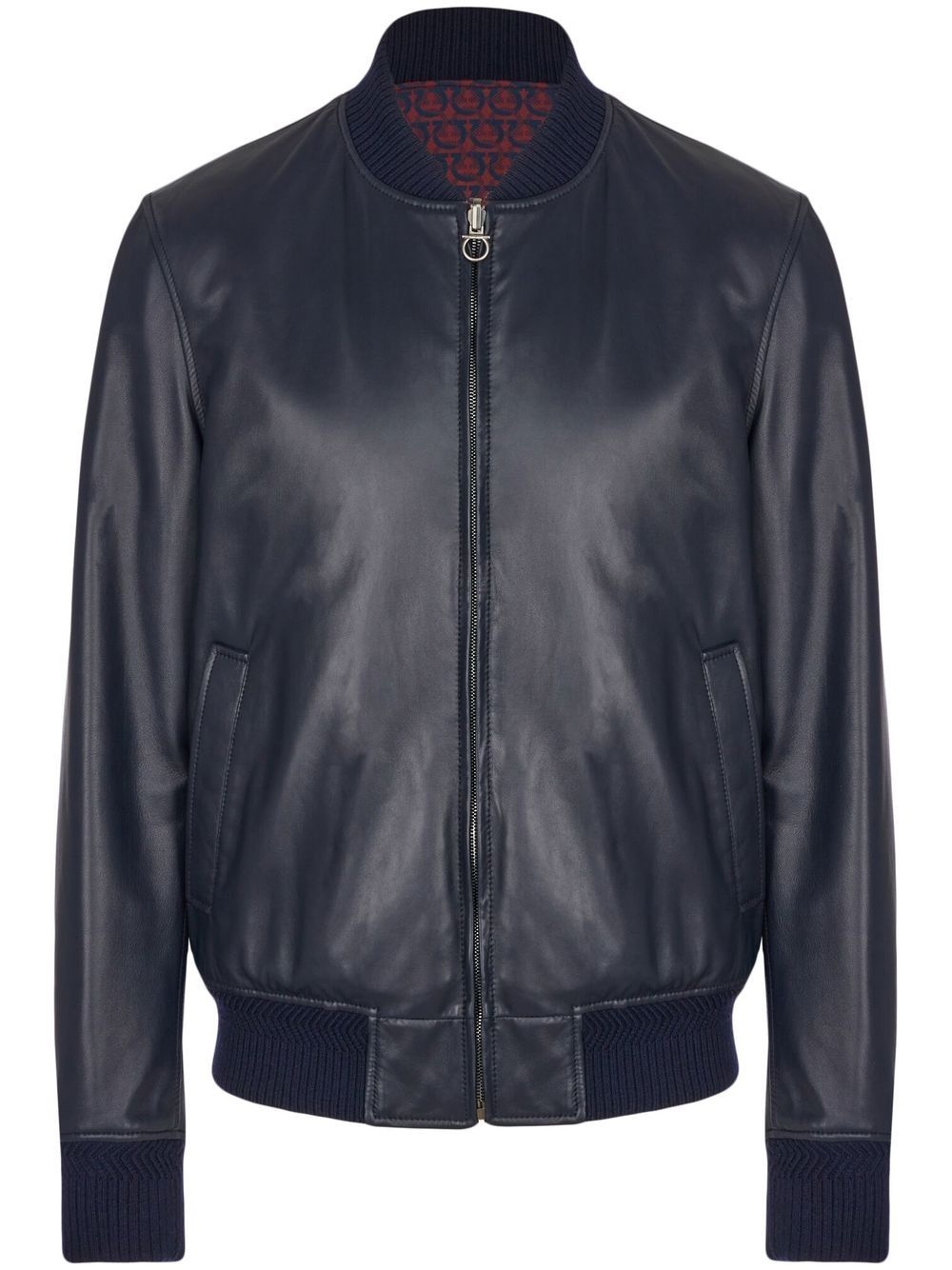 Gancini-print reversible bomber jacket navy blue/red nappa leather reversible Gancini print front zip fastening ribbed band collar ribbed cuffs ribbed hem long sleeves straight hem Made in Italy Composition Nappa Leather 100%