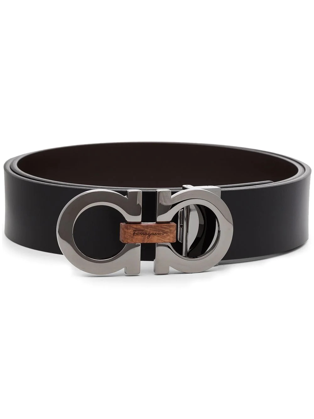 Gancini reversible leather belt Salvatore Ferragamo's belt is what you'd call an all-rounder. Made from smooth black leather, this reversible stlye is punctuated with the brand's silver-tone Gancini buckle that'll elevate your outfits that bit more. Who doesn't want to look sharp? Highlights - Black - Leather - Silver-tone buckle fastening - Reversible Made in Italy Composition Calf Leather 100% SIZE & FIT Measurement TOTAL LENGTH 40.15 in(102 cm) WIDTH 1.37 in(3.5 cm)