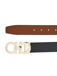Gancini reversible leather belt Highlights - Black/navy blue - Calf leather - Textured finish - Reversible - Gancini buckle - Logo-engraved gold-tone hardware - Front buckle fastening - Punched holes - Adjustable fit Made in Italy Composition Outer: CALFSKIN 100% SIZE & FIT Measurement WIDTH 1.37 in(3.5 cm)