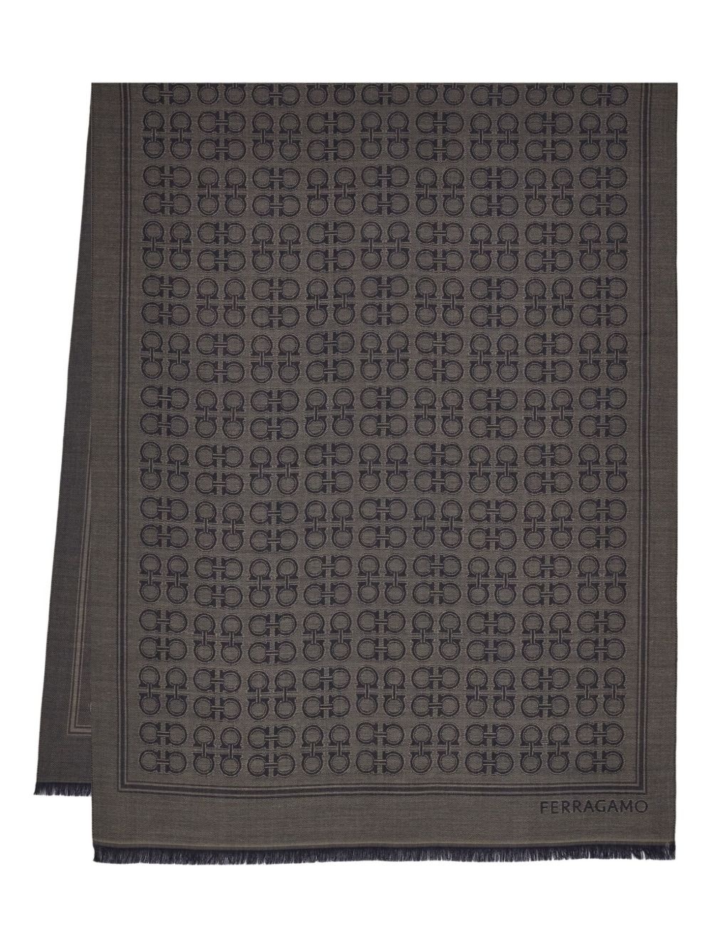 Gancini silk scarf Highlights - Taupe brown - Logo pattern - Framed design - Fringed edges - Rectangular shape Made in Italy Composition Virgin Wool 90%, Silk 10% SIZE & FIT Measurement LENGTH 70.86 in(180 cm) WIDTH 27.55 in(70 cm)