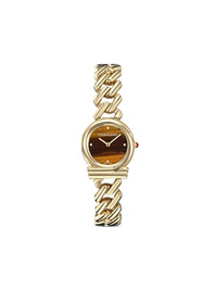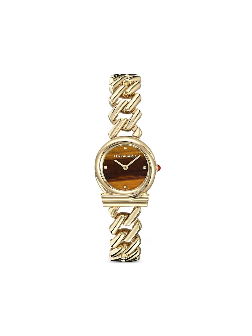 Gancini Twisted 28mm Highlights - Brown dial - Round case shape - 28mm case size - Tiger eye dial - Quartz movement - Gold-tone bezel - This item comes with a standard one-year warranty from the boutique. Imported