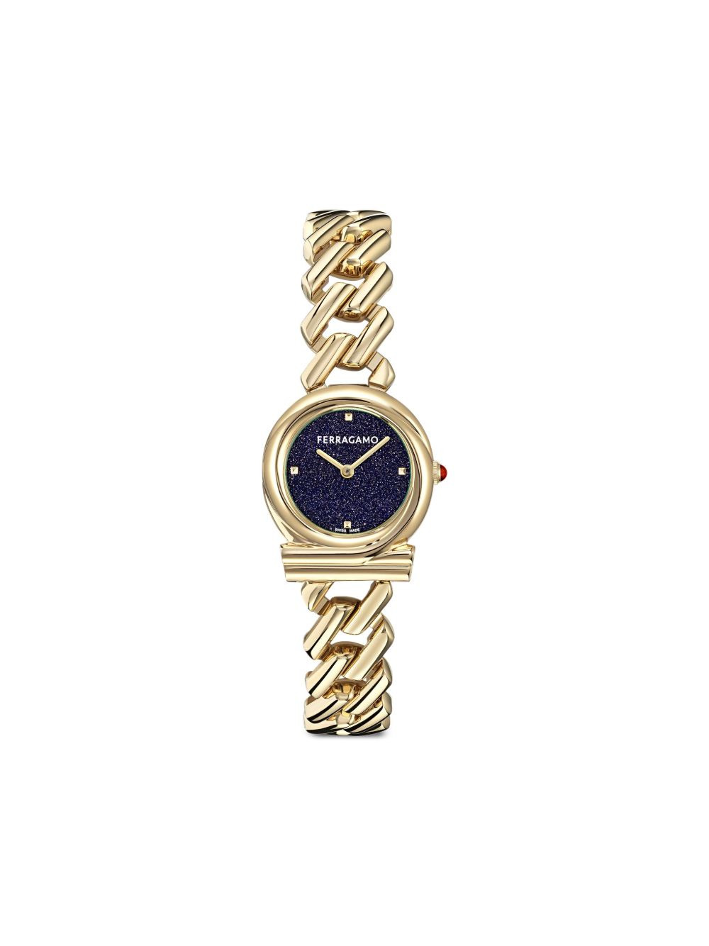 Gancini Twisted 28mm Highlights - Dark blue dial - Round case shape - 28mm case size - Cabochon crown - Quartz movement - Gold-tone bezel - This item comes with a standard one-year warranty from the boutique. Imported
