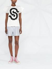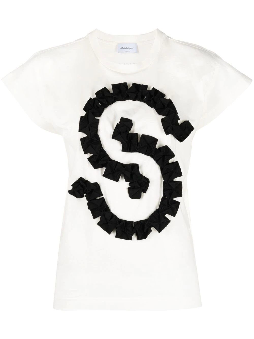 Gancio S cotton T-shirt Crafted in a cotton design with delicately flared sleeves, this Ferragamo T-shirt features the brand's S Gancio logo embroidered in contrasting gros grain origami to its front. Made in Italy Composition Cotton 100% SIZE & FIT Model measurements Height 5 ft 10 in(1.77 m) Bust/Chest 31.49 in(80 cm) Hips 33.85 in(86 cm) Waist 22.44 in(57 cm) FittingInformation This piece fits true to size. We recommend you get your regular size Cut for a relaxed fit Made with a mid-weight fabric Washing instructions Dry Clean Only