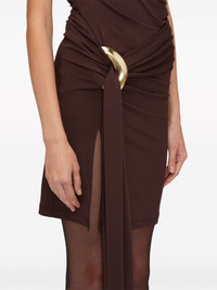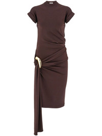gathered jersey dress Salvatore Ferragamo adds a bold hardware element to this jersey dress, emphasising its pliable nature and elegant aesthetic. Highlights - Espresso brown - Jersey texture - Round neck - Gathered detailing - Short sleeves - Gold-tone hardware - Straight hem - Thigh-length Made in Italy Composition Outer: Viscose 95%, Elastane 5% SIZE & FIT Measurement SLEEVE LENGTH 9.44 in(24 cm) HIPS 35.43 in(90 cm) LENGTH 33.46 in(85 cm) WAIST 25.98 in(66 cm)