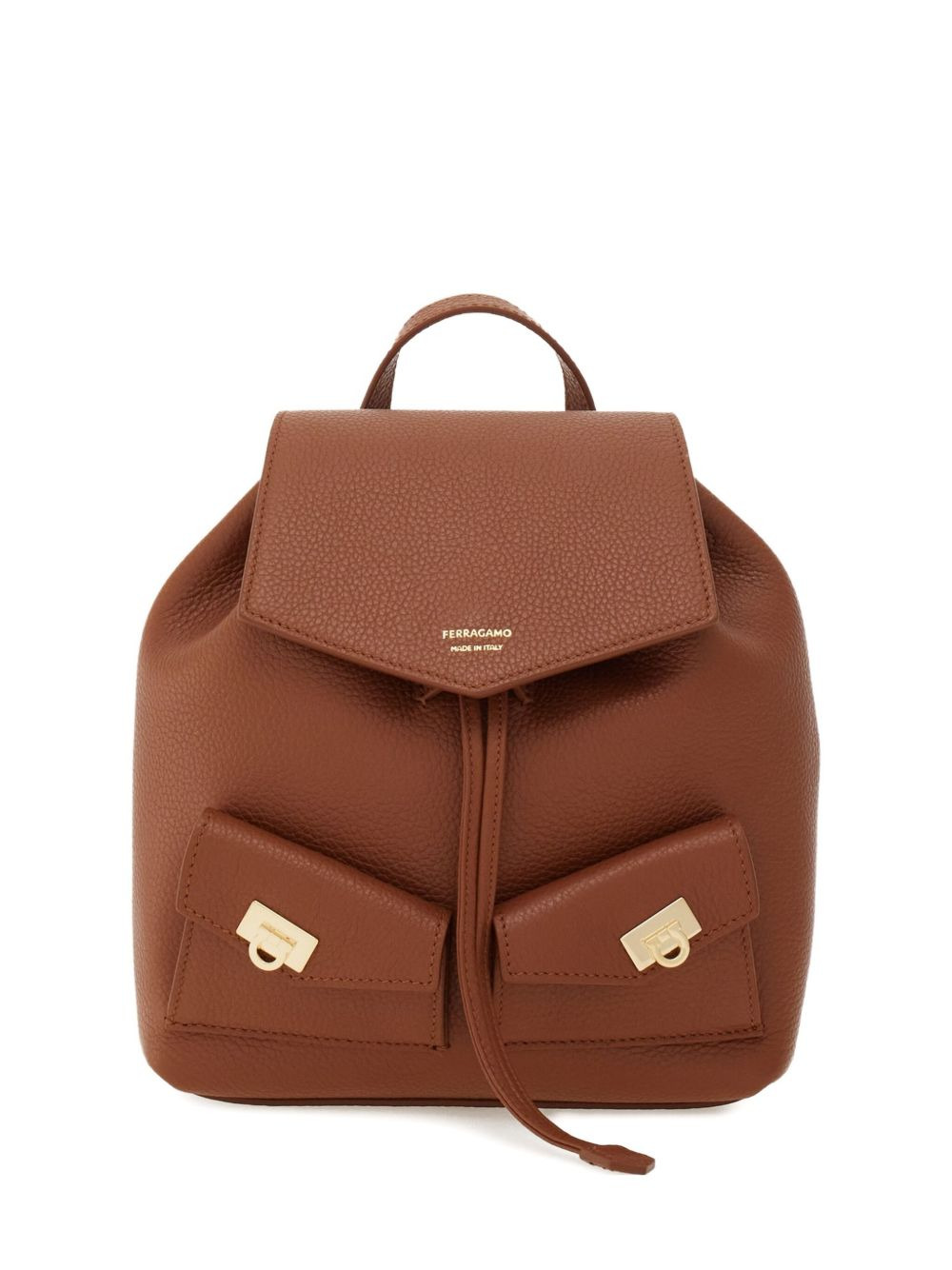 geometric-flap drawstring backpack Highlights - Brown - Calfskin leather - Geometric flap - Drawstring closure - Front pockets - Gold-tone buckle accents Made in Italy Composition Outer: CALFSKIN 100% SIZE & FIT Measurement DEPTH 4.33 in(11 cm) HEIGHT 9.44 in(24 cm) WIDTH 7.87 in(20 cm)