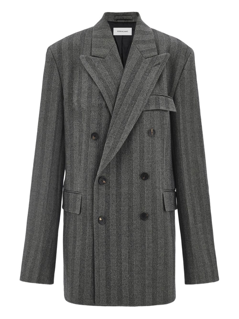 herringbone double-breasted blazer Highlights - Dark grey - Herringbone pattern - Double-breasted fastening Made in Italy Composition Virgin Wool 92%, Polyamide 6%, Elastane 2% Washing instructions Read Manufacturer Guidelines
