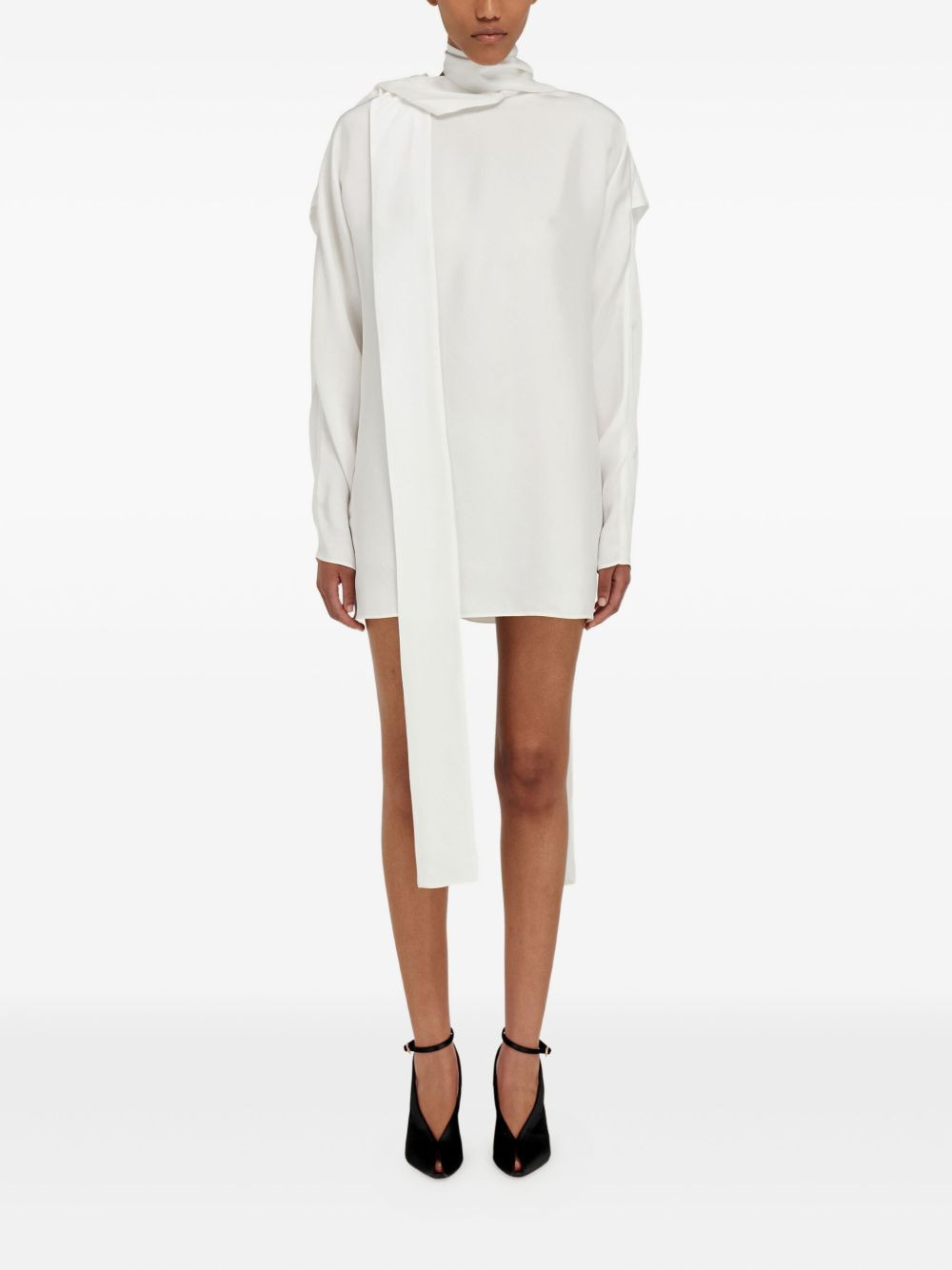high-neck draped-back mini dress Highlights - White - High neck - Draped back - Open back - Long sleeves - Twisted-sash detail Made in Italy Composition Outer: Viscose 100% Washing instructions Read Manufacturer Guidelines