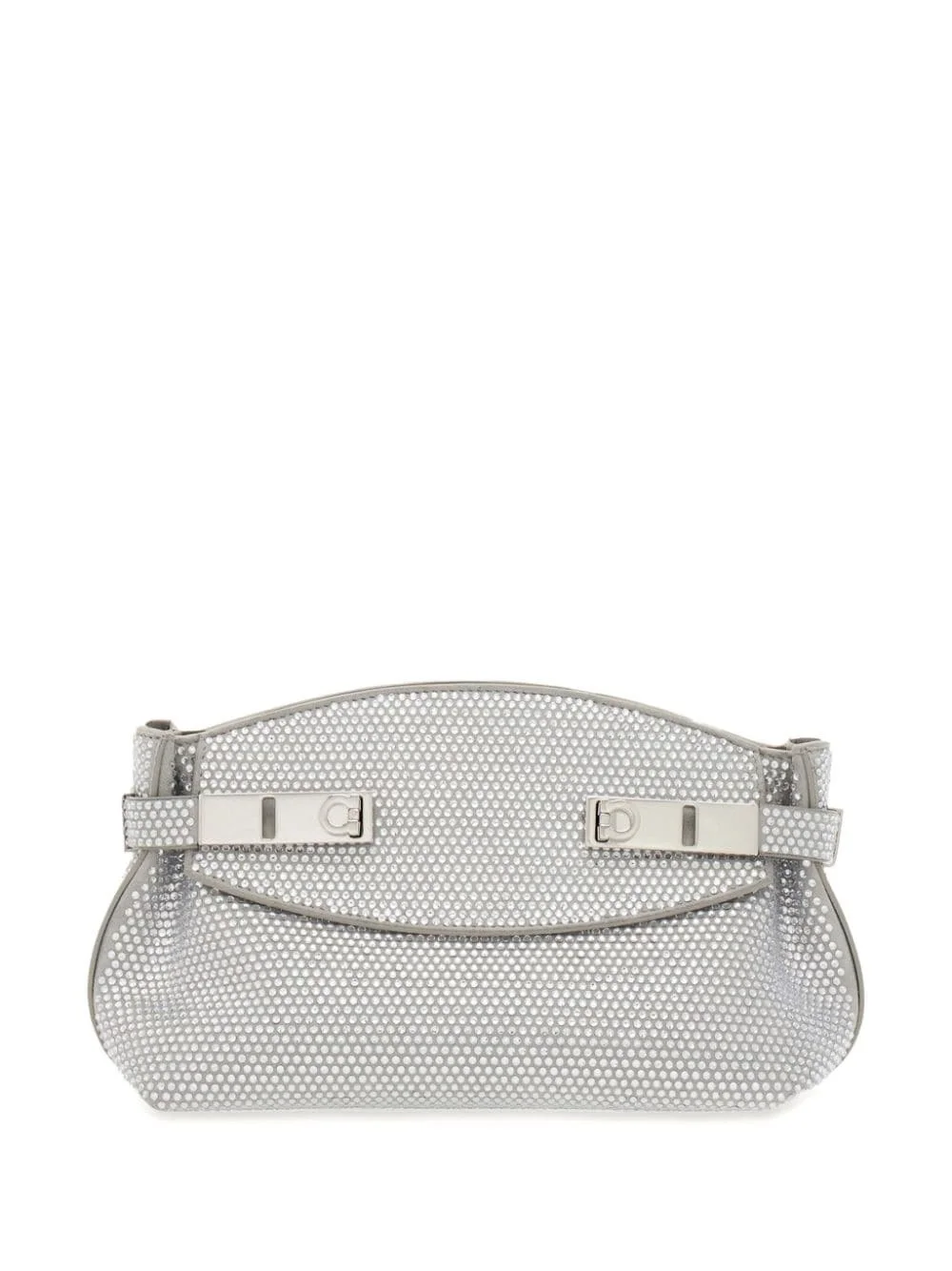 Hug crystal-embellished clutch bag Highlights - Grey/silver-tone - Lambskin - Crystal embellishment - Gancini flip-lock fastening - Adjustable detachable shoulder strap - Concealed magnetic fastening - Main compartment - Internal card slots Made in Italy Composition Outer: Lamb Skin 100% Lining: Lamb Skin 100%