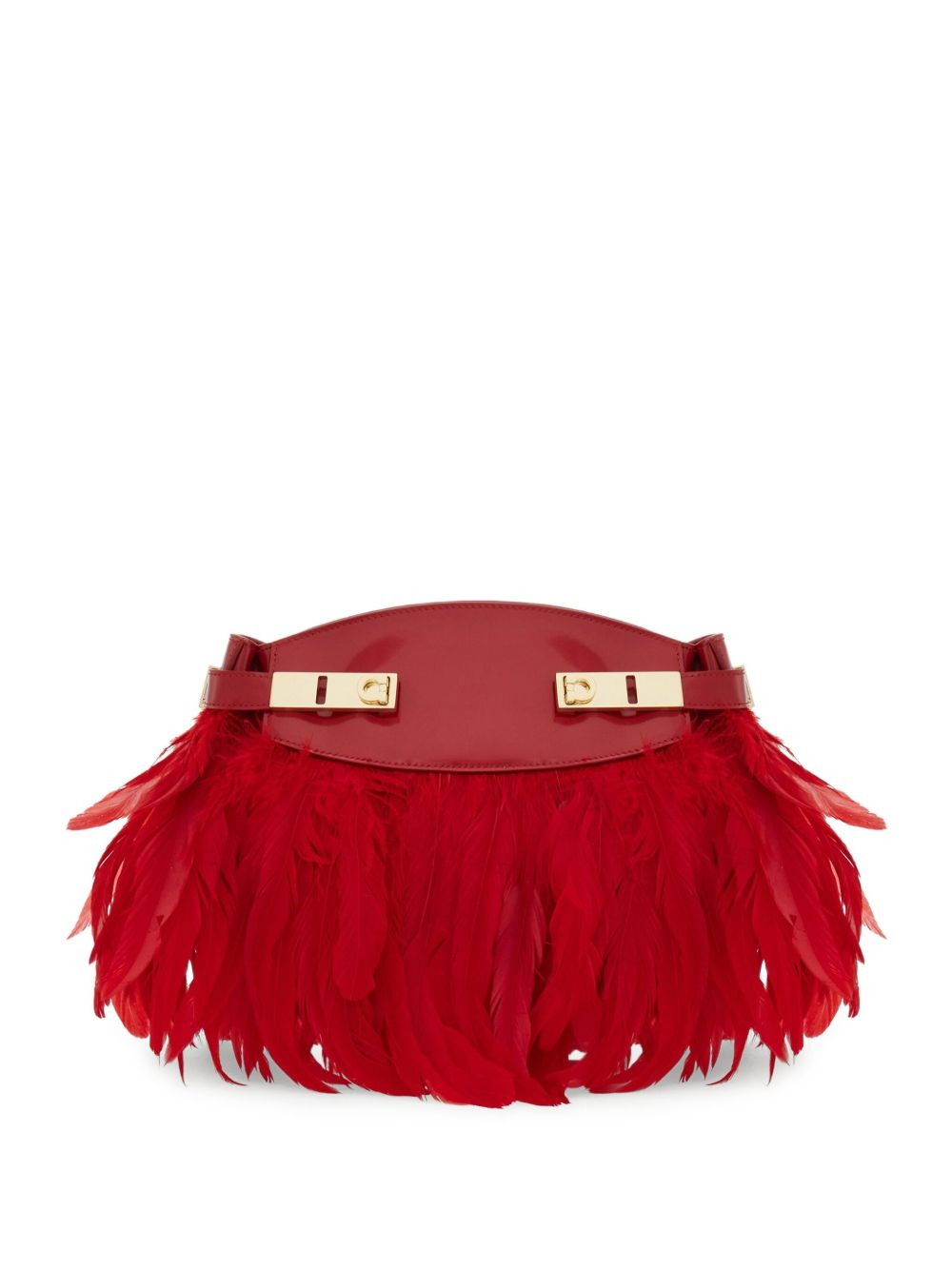 Hug feather-trimmed cross body bag Highlights - Red - Calfskin leather - Feather embellishment - Gancini buckle fastening - Magnetic clasp Made in Italy Composition CALFSKIN 55%, Ostrich Feather 45%