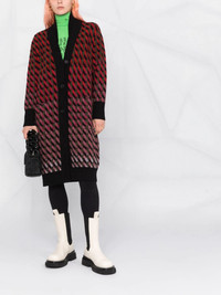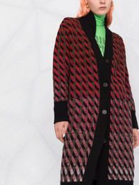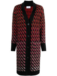 intarsia-knit cardi-coat red/black virgin wool/cashmere intarsia knit ribbed detailing V-neck front button fastening long sleeves mid-length Made in Italy Composition Virgin Wool 75%, Cashmere 25% SIZE & FIT Model measurements Height 5 ft 10 in(1.79 m) Bust/Chest 33.07 in(84 cm) Hips 35.82 in(91 cm) Waist 24.01 in(61 cm) FittingInformation This piece fits true to size. We recommend you get your regular size Cut for a loose fit Made with a mid-weight fabric Washing instructions Dry Clean Only