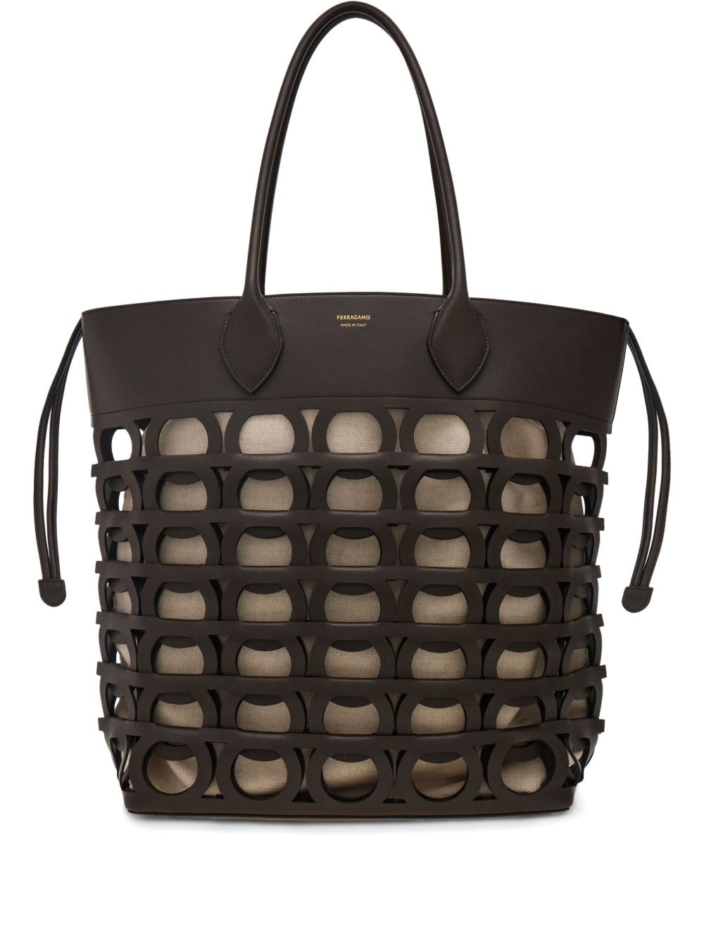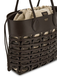 large Gancini tote bag Highlights - Brown - Drawstring fastening - Logo stamp to the front - Two long top handles Made in Italy Composition Outer: CALFSKIN 80%, Fabric 20% Lining: Fabric 100% SIZE & FIT Measurement DEPTH 5.31 in(13.5 cm) HANDLE 9.25 in(23.5 cm) HEIGHT 13.38 in(34 cm) WIDTH 18.11 in(46 cm)
