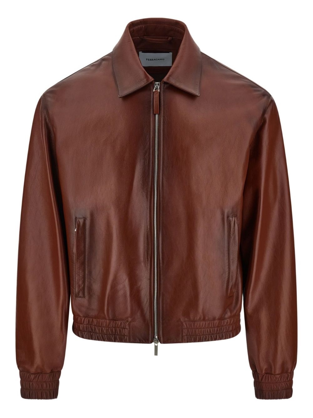 leather jacket Highlights - Cognac brown - Front two-way zip fastening - Two side welt pockets - Elasticated cuffs - Elasticated hem Made in Italy Composition Outer: Lambskin 100% Lining: Rayon 100% Washing instructions Specialist Cleaning