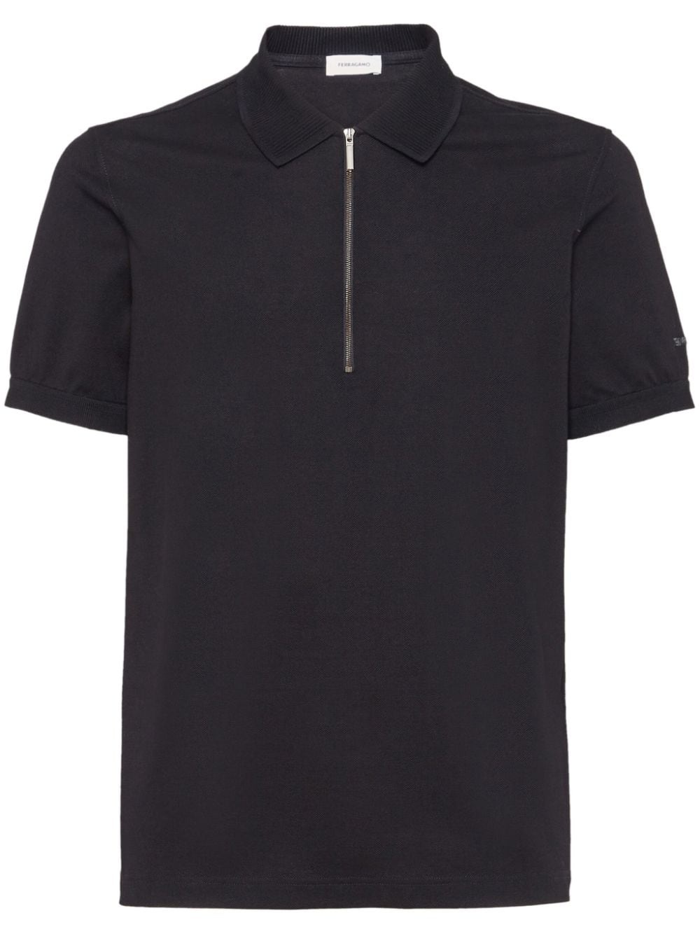 logo-embroidered cotton polo shirt This understated polo shirt by Italian-label Salvatore Ferragamo is crafted from pure cotton. Its classic silhouette is fastened with a silver-tone zip and embroidered with logo lettering on the sleeve. Highlights - Black - Cotton - Polo collar - Short front zip fastening - Short sleeves - Embroidered logo at the sleeve - Straight hem Made in Italy Composition Outer: Cotton 100%