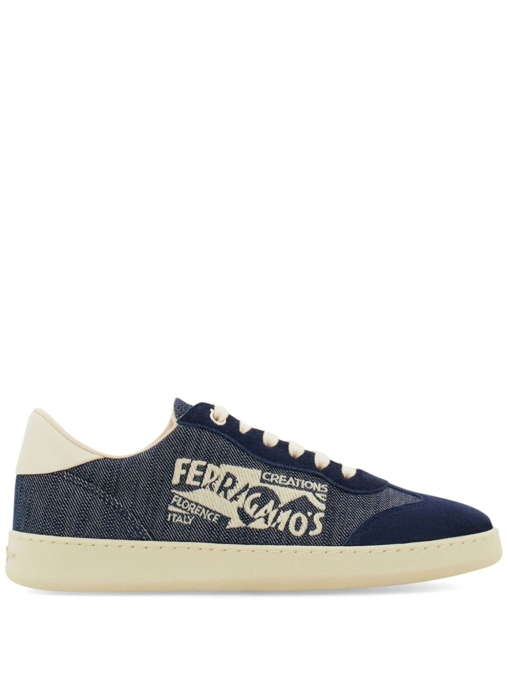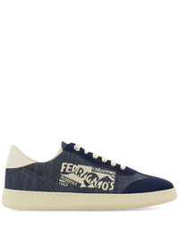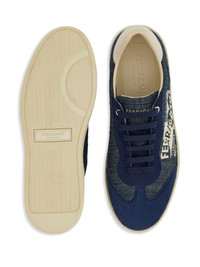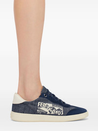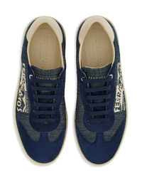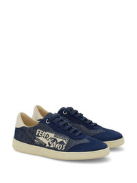 logo-print low-top sneakers Highlights - Blue - Calf leather - Logo print to the side - Contrasting heel counter - Round toe - Front lace-up fastening - Logo-print tongue - Branded insole - Rubber sole Made in Italy Composition Outer: Fabric 70%, Calf Leather 30%