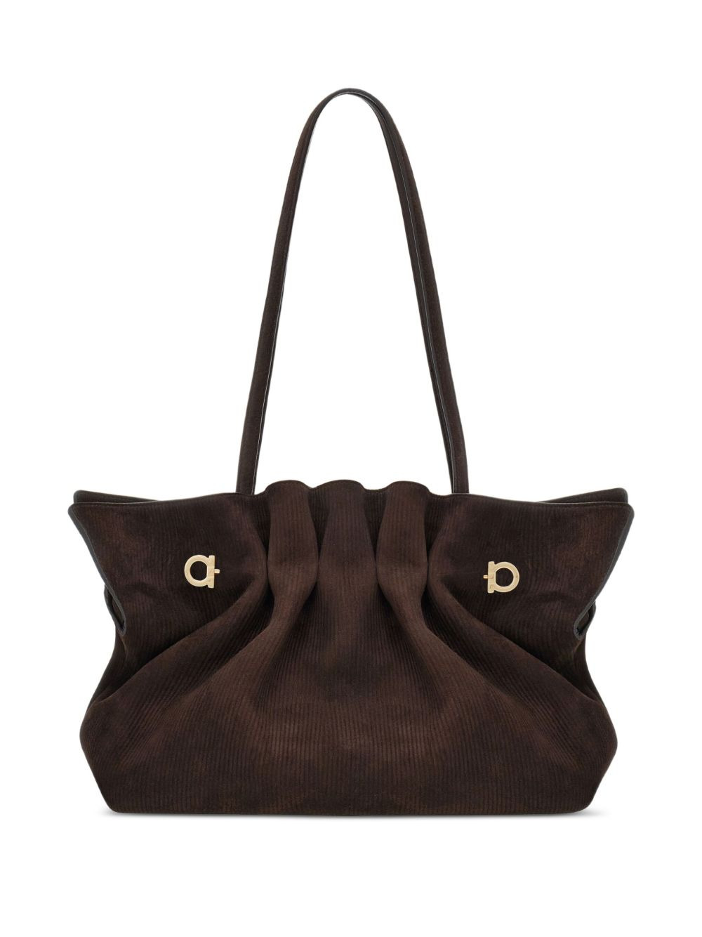 medium gancio-embellished gathered tote bag Highlights - Dark brown - Calf suede - Gathered detailing - Top handles - Gancio pins Made in Italy Composition Outer: Calf Suede 100%