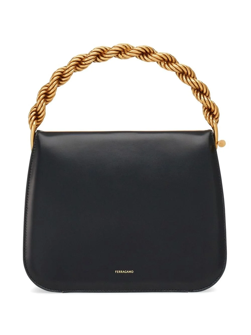 medium Semi-rigid leather tote bag Highlights - Black - Calf leather - Matte finish - Logo stamp to the front - Gold-tone hardware - Snap-lock closure - Single rope-chain top handle - Multiple internal slip pockets Made in Italy Composition Outer: CALFSKIN 100% Lining: CALFSKIN 100% SIZE & FIT Measurement WIDTH 8.85 in(22.5 cm) HEIGHT 7.08 in(18 cm) DEPTH 3.54 in(9 cm)
