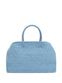 medium The Hug raffia tote bag Highlights - Sky blue - Raffia - Leather trim - Interwoven design - Gancini flip-lock fastening - Silver-tone hardware - Hanging key fob - Adjustable side straps - Clasp fastening - Two top handles - Main compartment - Internal card slots Made in Italy Composition Outer: CALFSKIN 100%, Raffia 100% SIZE & FIT Measurement DEPTH 7.87 in(20 cm) HEIGHT 10.23 in(26 cm) STRAP 21.65 in(55 cm) WIDTH 16.14 in(41 cm)